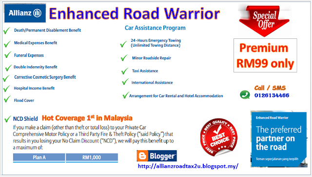 Allianz enhanced road warrior. Safeguard yourself with the best roadside personal accident today. Enhanced road warrior bukan sahaja melindungi anda dan penumpang anda daripada kemalangan diri malah terdapat pelbagai manfaat insurans dan faedah lain pelan ini juga memberi anda 24 jam program bantuan kereta allianz. Enhanced road warrior is a 24 hour roadside assistance which offers a very comprehensive scope of protection during a car breakdown or for when you or your passengers sustain personal injuries in the event of an accident. Underwritten by allianz enhanced road warrior protects you and your passengers against accidental death disability and hospitalization in the event of an accident and offers flood cover free towing and other car assistance services for just rm 9 58 per month including stamp duty.