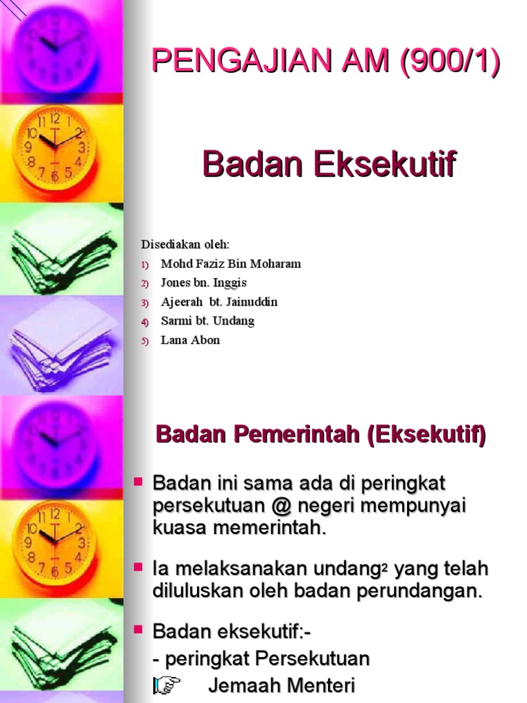 Badan eksekutif di malaysia. Pakaian yang selalu dipakai oleh badan eksekutif di luar negara. I jemaah menteri merupakan badan tertinggi yang menjalankan kuasa eksekutif. Di malaysia kabinet jemaah menteri merupakan badan tertinggi yang menjalankan kuasa eksekutif jemaah menteri terdiri daripada seorang perdana menteri dan beberapa orang menteri yang bertanggungjawab ke atas kementerian masing masing. I merupakan agensi tertinggi dalam jentera pentadbiran persekutuan.