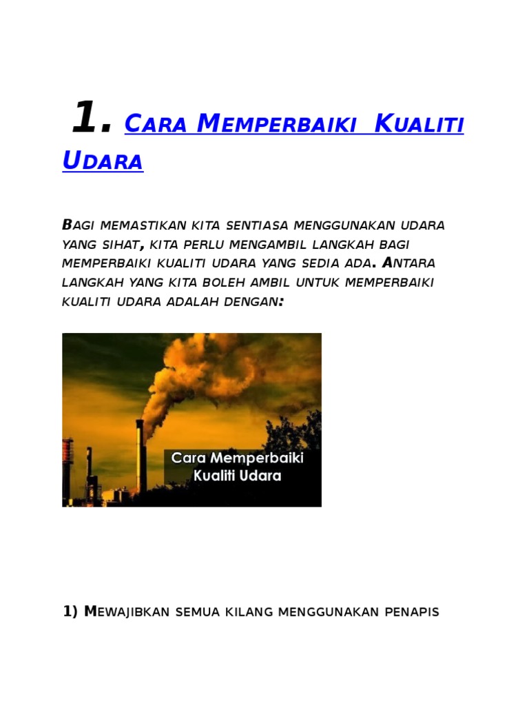 Cara memperbaiki kualiti udara cikgu hailmi rabu januari 08 2014. Pastikan pengaliran udara yang baik di rumah. Kami mendapati 42 kajian yang menilai pelbagai langkah untuk mengurangkan pencemaran udara di negara negara di dunia walaupun kebanyakan kajian adalah dari negara berpendapatan tinggi. Antaranya majlis bandaraya shah alam yang kini ke arah mewujudkan bandar hijau untuk memasang sensor ini bagi membantu kualiti udara di kawasan mereka.