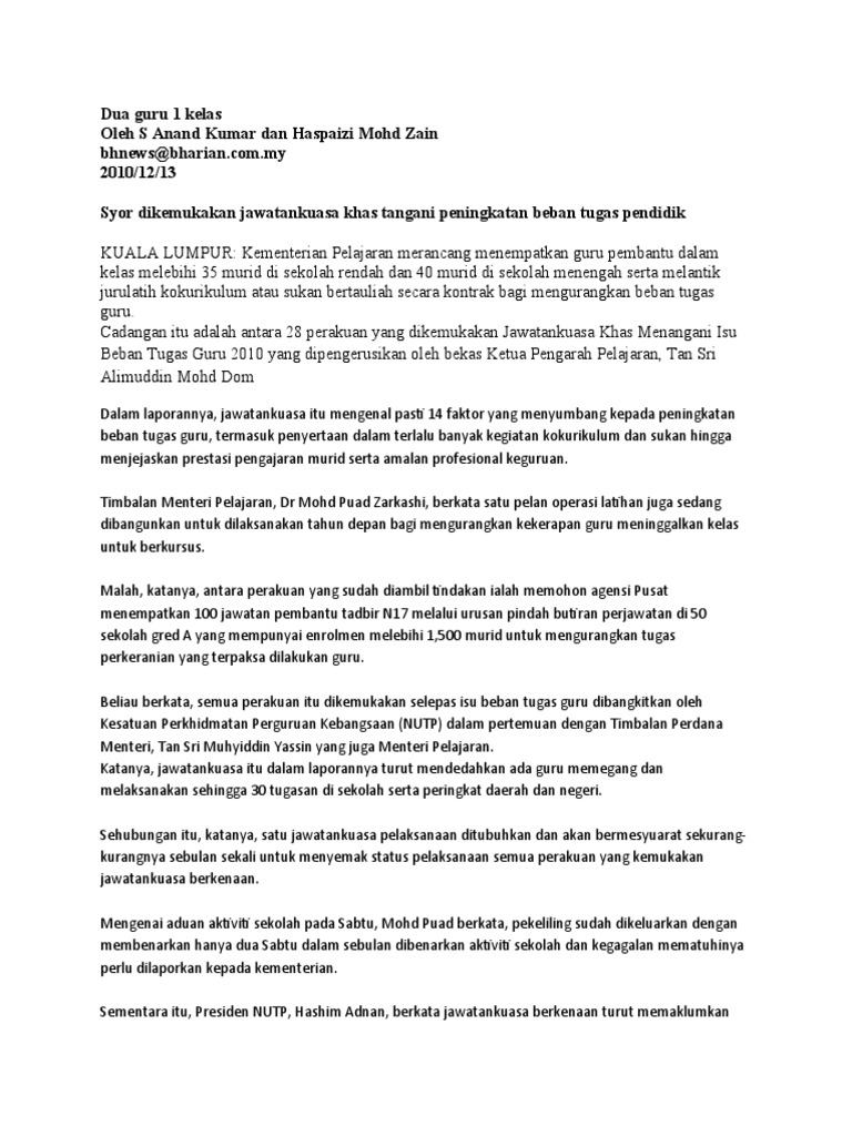 Isu beban tugas guru. Maka jawatankuasa bebanan tugas guru akan menyediakan garis panduan tugas utama guru dan tugas yang tidak boleh dilakukan oleh guru. Dapatan kajian ini akan membantu kpm dalam menangani isu beban tugas guru. Academia edu is a platform for academics to share research papers. Dewasa ini dunia pendidikan kerapkali dihujani dan digemparkan dengan pelbagai isu terutama yang berkait dengan guru.