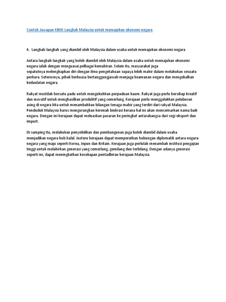 Bagi 14 lagi langkah itu telah pun diserapkan dalam bidang ekonomi utama negara nkea dan bidang keberhasilan utama negara nkra. Contoh jawapan kbkk langkah malaysia untuk memajukan ekonomi negara. Selain itu masyarakat juga sepatutnya melengkapkan diri dengan ilmu pengetahuan supaya lebih mahir dalam melakukan sesuatu perkara. Misalnya apabila berlakunya kegawatan ekonomi 1998 rakyat malaysia telah bersatu padu demi menghadapi cabaran yang dihadapi dan bergabung tenaga untuk memajukan ekonomi negara semula.