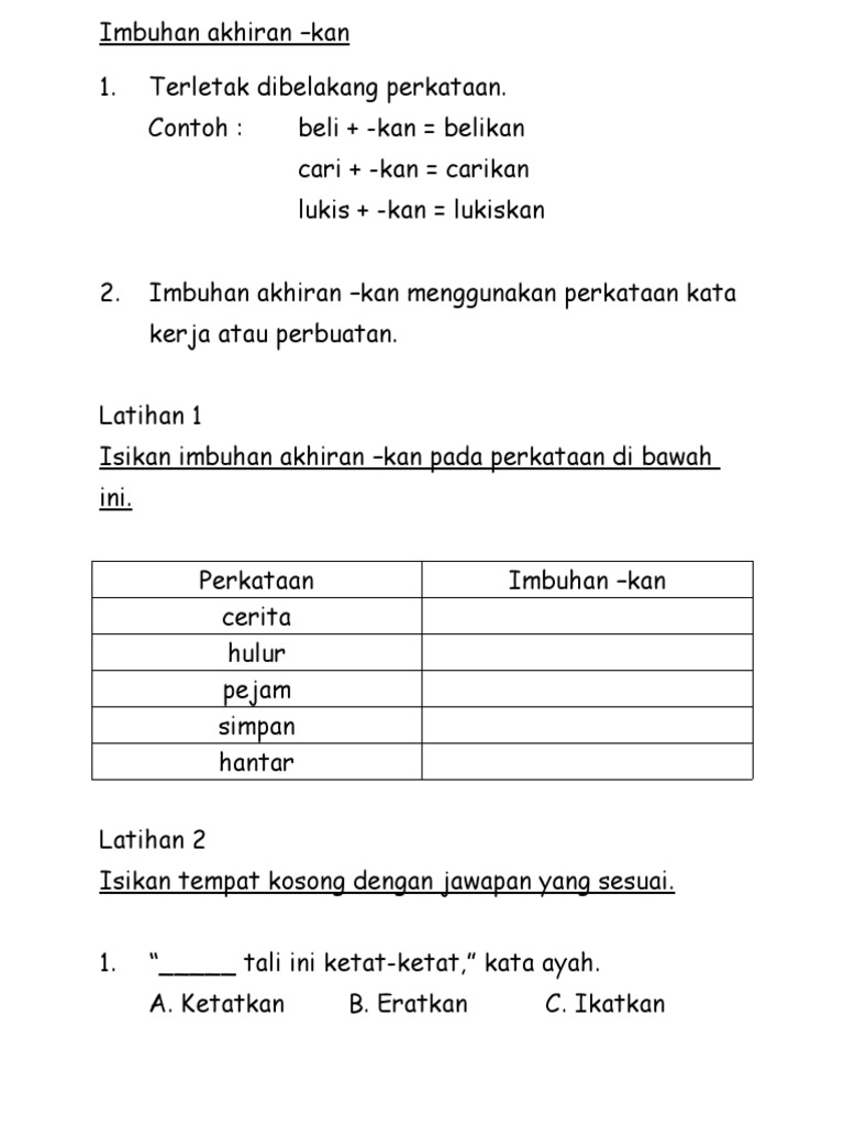 Latihan imbuhan awalan and akhiran. Menyebabkan atau membuat jadi. Latihan simpulan bahasa 1. Kata nama khas latihan 1.