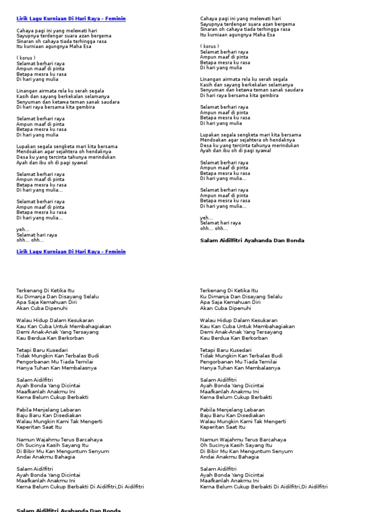 Mari semua kita gembira menyambut hari yang berbahagia. Selamat selamat hari raya kami ucapkan pada semua selamat selamat hari raya pada yang miskin atau yang kaya hari yang menyatukan kita semua untuk bersyukur pada yang maha esa. Lemang ketupat semua telah terhidang untuk di jamu pada tetamu yang datang di persilakan tua dan muda tiba hari raya semua bergembira. Salah tersilap atau keterlanjuran biarlah sama kita saling memaafkan maklum kita hanya manusia tak daya melarikan diri dari dosa.