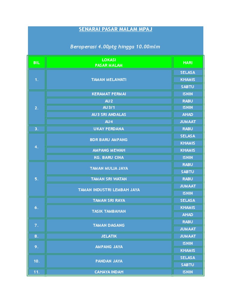 Senarai pasar malam mpaj beroperasi 4 00ptg hingga 10 00mlm bil lokasi pasar malam hari 1. Senarai lokasi pasar malam di sekitar klang. Klik sini untuk membantu click here on how to support. Salam hari isnin guyys hari ni murtabak muslim beroperas.