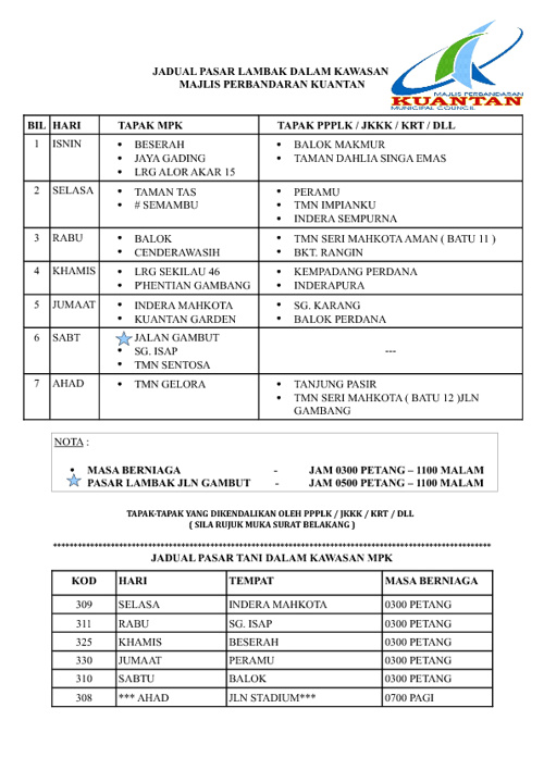 Senarai lokasi pasar malam dan pagi sekitar kuantan pahang senarai pasar lambak. Pasar malam lambak tani. Berserah jaya gadinglorong alor akar 15. Panggung wayang mbo terletak di tingkat 4 kuantan city mall.