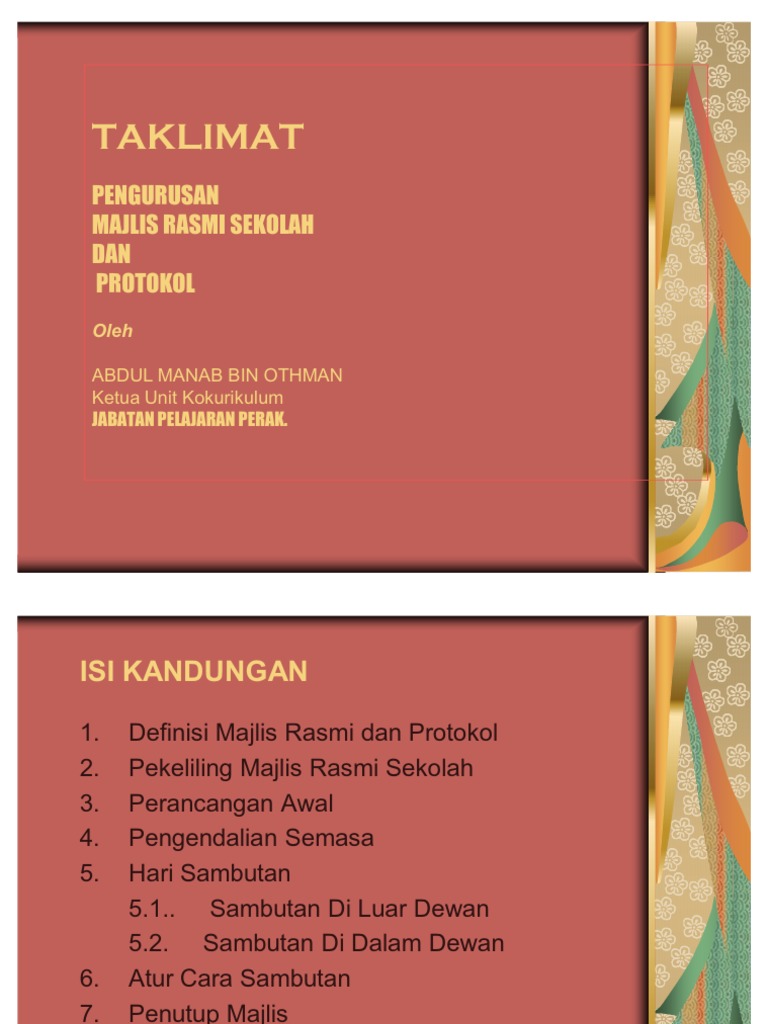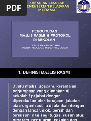 Secara ringkasnya protokol berkaitan dengan peraturan dalam penganugerahan darjah kebesaran susunan keutamaan panggilan hormat jemputan tempat duduk dan sebagainya. 3 tugas utama mengawal kelancaran majlis. Pengacaraan majlis rasmi peranan seorang pengacara majlis adalah berdasarkan jenis majlis dan tahap majlis. Pekeliling majlis rasmi majlis majlis rasmi di sekolah ialah hari ucapan dan penyampaian hadiah hari ibubapa hari terbuka hari sukan dan hari perasmian sekolah.