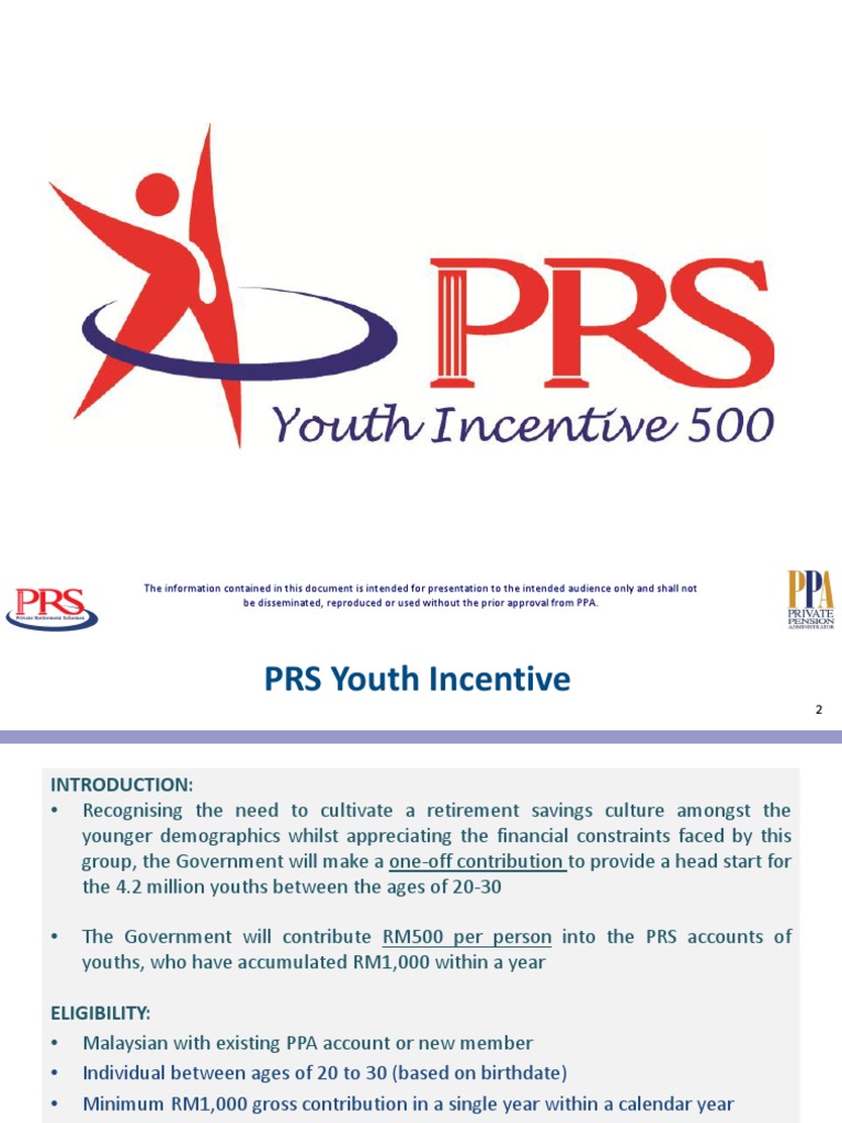 To encourage young malaysians to start voluntary retirement savings at an early age the government introduced the prs youth incentive programme during the tabling of budget 2014. The user should seek personal advice from their prs consultant for their own personal situations or circumstances. Albert einstein once said compound interest is the eighth wonder of the world. It was designed to be a voluntary long term savings and investment scheme to encourage malaysians to save more for retirement.