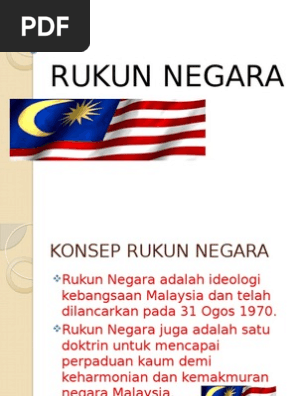 Sewajarnyalah setiap rakyat memahami latar belakang objektif dan prinsip rukun negara itu. Ideologi ini digubal semasa negara sedang berada di bawah pimpinan mageran majlis perundingan negeri badan yang bertanggungjawab menggubalnya. Dasar wawasan negara 2001 2010 atau dikenali sebagai wawasan 2020 merupakan usaha kerajaan untuk mengembangkan ekonomi. Rukun negara seharusnya dijadikan panduan oleh setiap rakyat yang mengaku dirinya sebagai warganegara malaysia.