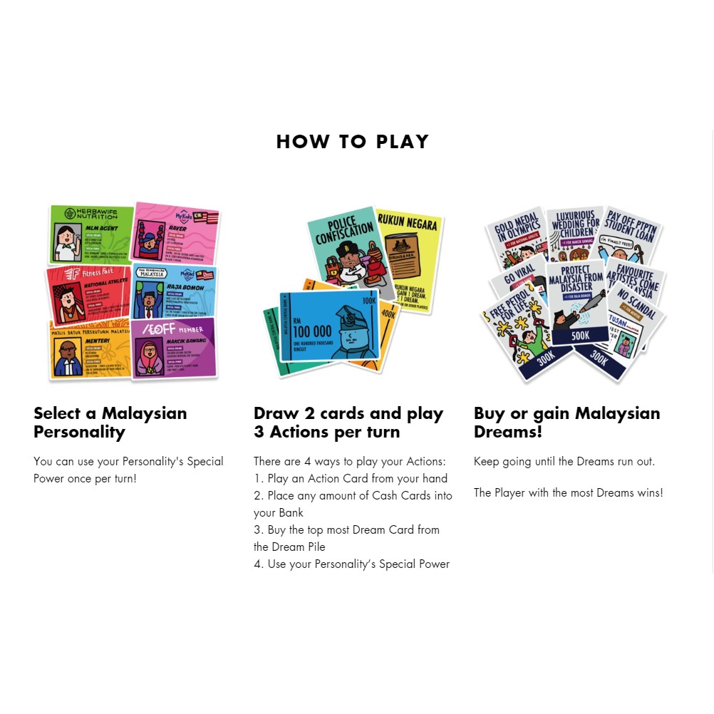 Select a malaysian personality that has a special power. We are authorized retailer for the malaysian dream card game. For the. Draw 2 cards and play 3 actions per turn there are 4 ways to p.