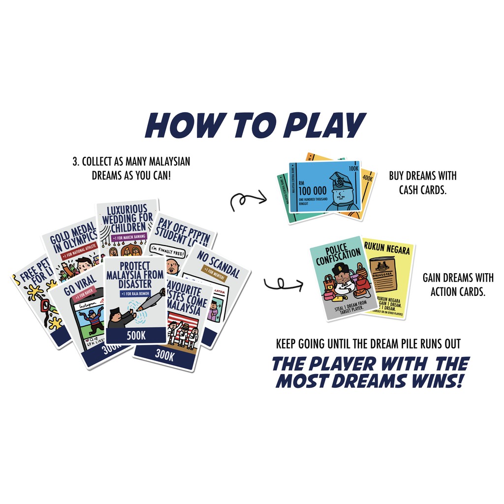 A malaysian card game that lets you pay steal and sabo your way to be the perfect malaysian. The malaysian dream card game by mgag is an interactive card game where you can sabotage complain and pay your way to be the perfect malaysian. You should have 104 cards in total 6 x personality cards 18 x dream cards 56 x action cards 24 x cash cards. The malaysian dream by mgag.